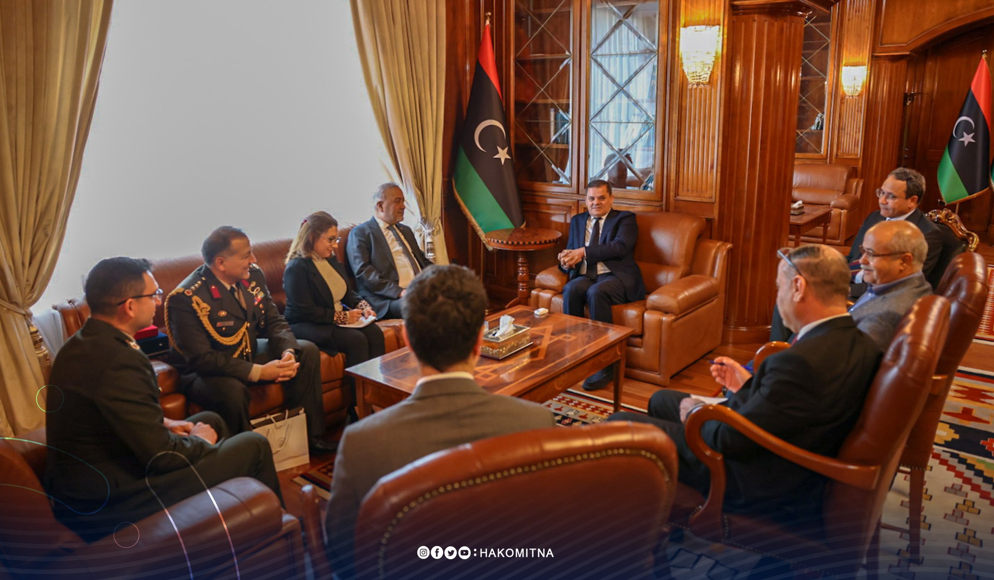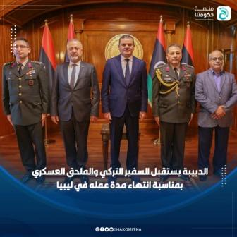 استقبل رئيس حكومة الوحدة الوطنية وزير الدفاع السيد عبد الحميد الدبيبة ،بمكتبه مساء يوم الثلاثاء الموافق 10 يناير 2023 ،السفير التركي لدى ليبيا كنعان يلماز والعاملين بالملحقية العسكرية بالسفارة ،بمناسبة انتهاء مدة عمل الملحق العسكري في ليبيا ،وذلك لتقديم الشكر على التعاون الايجابي طيلة عمله بالسفارة ،مؤكداً ضرورة التعاون مع دولة تركيا في المجالات الاقتصادية والسياسية والعسكرية.