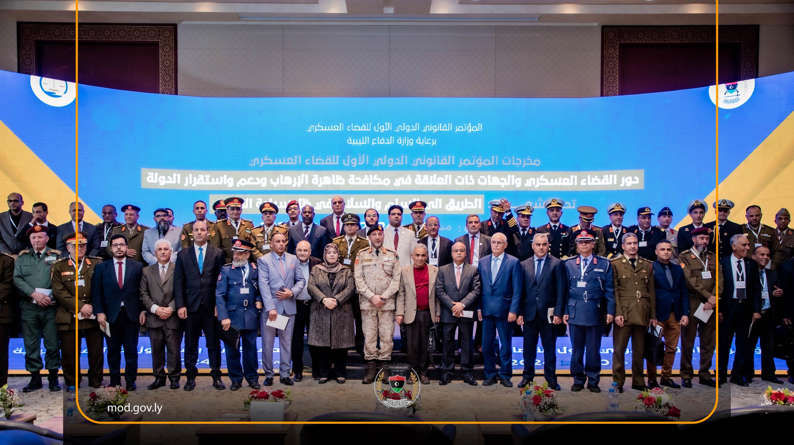 بحضور الفريق اول محمد الحداد رئيس الاركان العامة للجيش الليبي ورئيس المحكمة العليا بليبيا المستشار عبدالله بورزيزة ومعالي وزيرة الشؤون الاجتماعية الاستاذة وفاء الكيلاني والسيد مدير مكتب وزير الدفاع وآمر قوة البنيان المرصوص ورئيس المباحث الجنائية وعدد من السفراء والملحقين العسكريين الاجانب بليبيا وجمع غفير من المسؤولين والاكاديميين والمهتمين بالشان القانوني اسدل الستار اليوم عن المؤتمر القانوني الدولي الاول تحت رعاية وزارة الدفاع وذلك بالإعلان عن مخرجات المؤتمر حيث قدمت اللجنة التحضيرية واللجنة العلمية إيجازا عن نتائج المؤتمر ومخرجاته تخلل ذلك عروضا مرئية للمؤتمر وحلقة نقاش بين الأساتذة المشاركين.